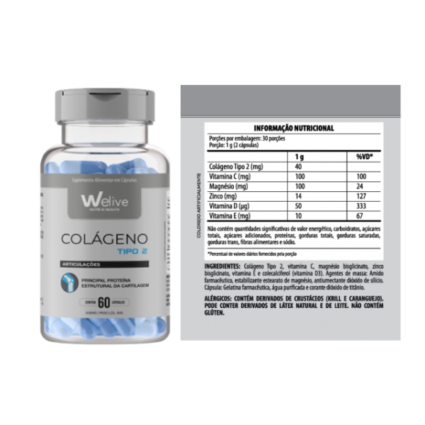Colágeno Tipo 2 We Live Suplementos é um suplemento de alta performance desenvolvido especialmente para promover a saúde das articulações e a mobilidade corporal. Formulado com colágeno tipo II não desnaturado (UC-II ), combinado com vitamina C e magnésio, age diretamente na preservação das cartilagens e na redução de processos inflamatórios articulares.